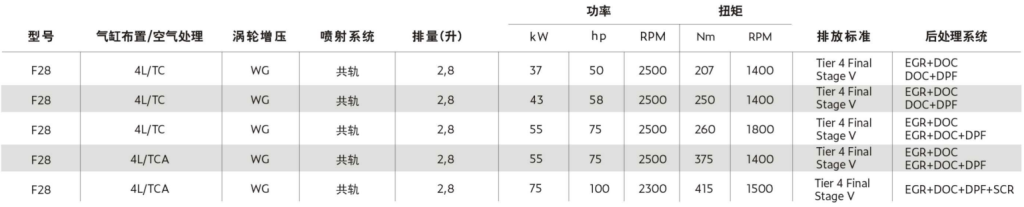 菲亞特動力科技推出了一款全新2.8升發(fā)動機(jī),以滿足緊湊型工程機(jī)械裝備不斷提高的挑戰(zhàn)性需求。得益于F28緊湊布局設(shè)計和提高的輸出功率,同時尺寸比競爭對手的大多數(shù)發(fā)動機(jī)小5%,使其可提供兼顧對布置空間和性能表現(xiàn)要求的首選發(fā)動機(jī)解決方案。其優(yōu)異的扭矩響應(yīng)能夠滿足多種設(shè)備的需求,適用于小型工程機(jī)械物料搬運(yùn)設(shè)備,以及固定機(jī)械應(yīng)用。